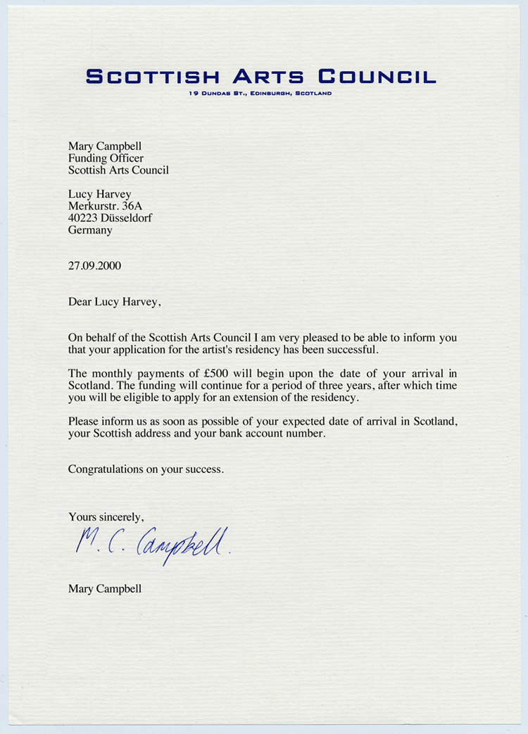 I'm actually writing to you to ask you if you could possibly do a favour for me. You probably remember me talking to you about wanting to live in the Outer Hebrides and now I'm finally moving there. I applied for a residency from the Scottish Arts Council and I just heard today that I got it so I've got money for three years which is great.